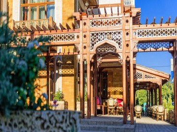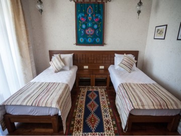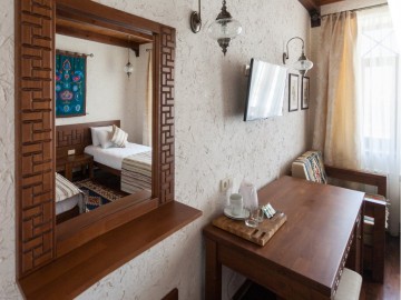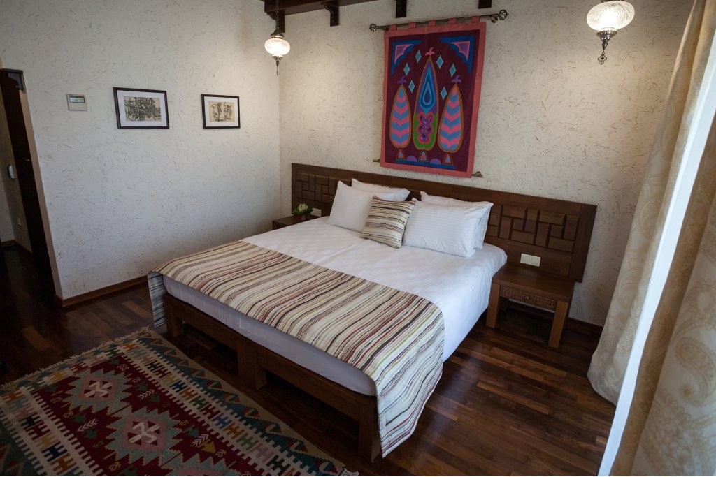 Тематический номер — Люкс «Нар»: Номер с прекрасным панорамным видом. Выполнен в традиционном восточном стиле и оснащен всем необходимым. В номере великолепная мебель с резьбой ручной работы, тканые ковры и салфетки. Изящные бра, подушки с традиционной вышивкой.