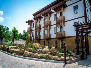 «Джеваль» покоряет внешним убранством – резные балконы, арки, крыша из черепицы-татарки, архитектура в традициях Крымского ханства. В том же стиле выполнен внутренний дизайн. Этническая аутентичность мирно уживается с высокими стандартами обслуживания и заботой о здоровье гостей. Общая концепция отеля основывается на трех «Э».