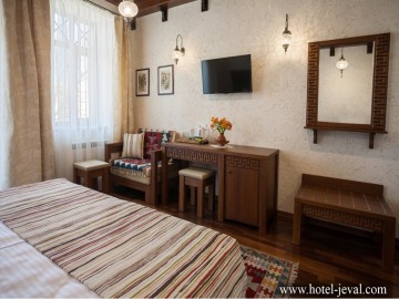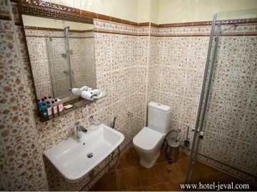 Номер для людей с ограниченными возможностями: Прекрасный и просторный номер площадью 21,6 кв.м. хорошо освещен и оформлен в восточном стиле.Этно-отель Джеваль, один из немногих отелей в Евпатории, в котором подготовлены номера для размещения гостей с ограниченными физическими возможностями. Номер данной категории без порогов, санузлы оборудованы специальными креплениями.