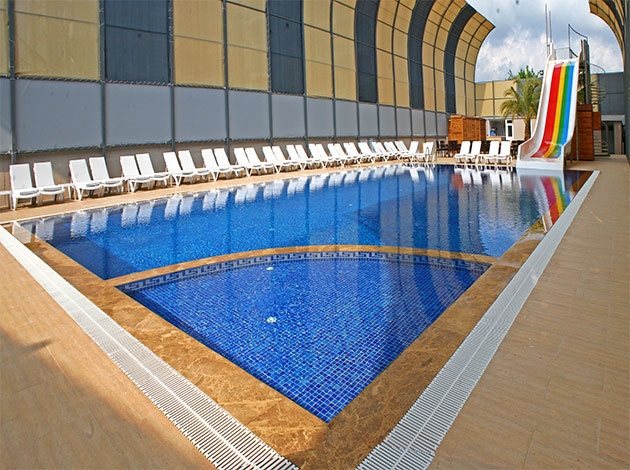 - Бассейны: 1 женский бассейн (231 м2) с детским разделом и горочкой (15 м). 1 мужской бассейн (198 м2) с детским разделом и горочкой (14 м).