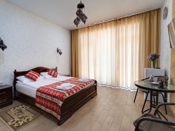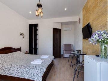 Двухуровневый номер студио: в номере: двуспальная кровать King Size, диван-кровать, кондиционер, телевизор, холодильник, шкаф купе, сейф. В стоимость номеров включено: набор полотенец, пользование общей кухней, Wi-Fi. Вид из номера: на внутренний двор. Балкон.